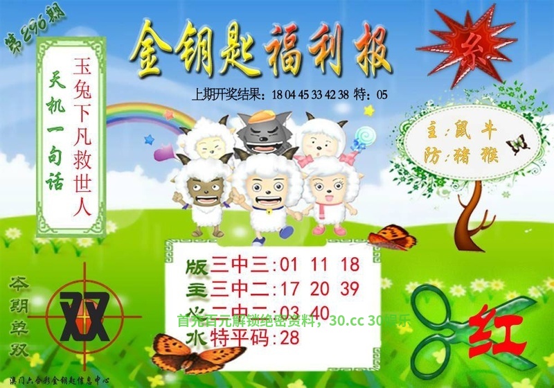 | 296期:【金钥匙福利报】【开猴22】 破解图文:玉兔下凡救世人 高手七肖:兔鼠蛇牛猪猴虎 |